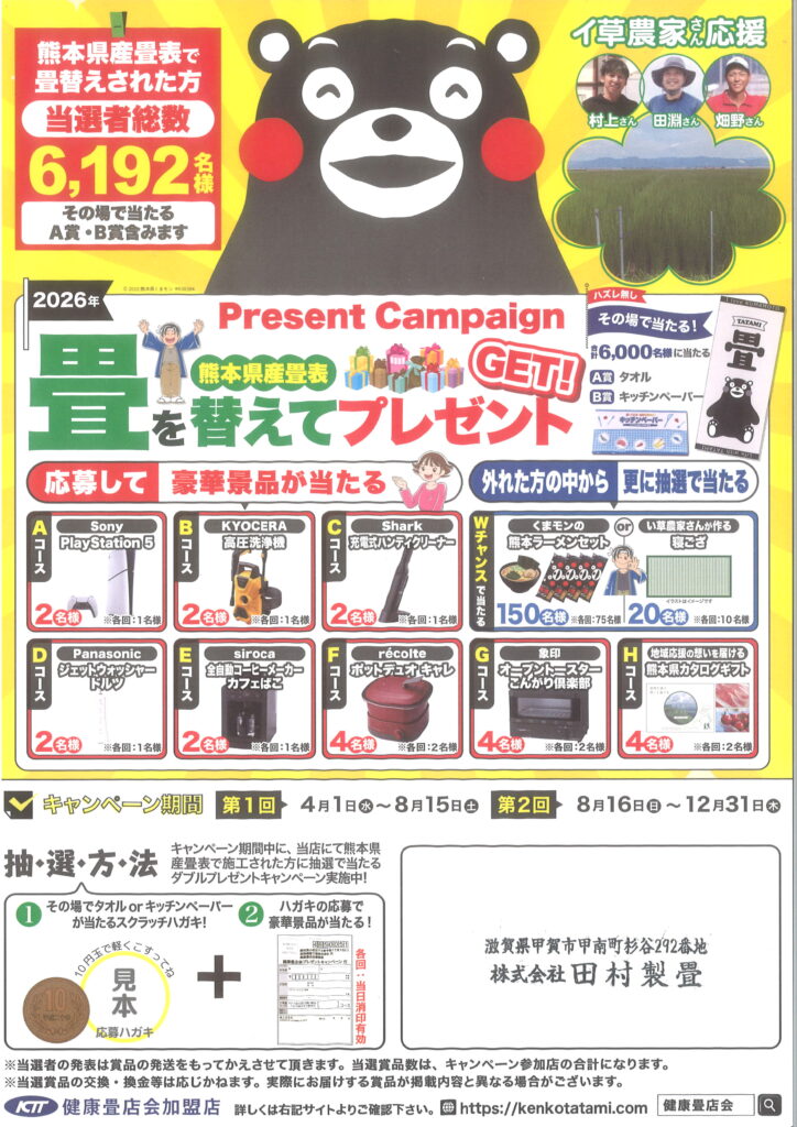 暖かいな、と感じる日がずいぶん増えてきましたね。東京の方では桜も開花したようですし、夏タイヤへの交換も済ませて、いよいよ春がやってきます!4月1日より、熊本産畳表にて畳替えいただいた方にもれなくチャレンジしていただける、毎年恒例の「くまモンプレゼントキャンペーン」2026年バージョンがスタートいたします。新年度、新学期、新生活のスタートに、気分も新たにぜひ畳替えをご検討ください。